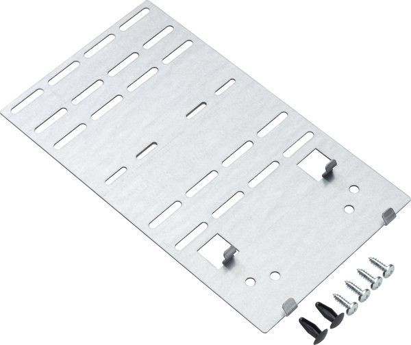 Montageplatte aus Stahlblech, inkl. Befestigungsschrauben, zur Montage an Stago/van Geel Kabelrinnen, zur Aufnahme von Abox Abzweigkästen, Befestigungsabstand bis zu 130mm,