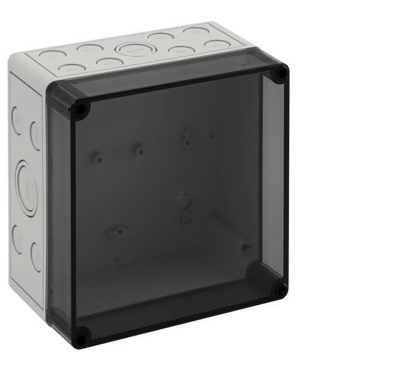m = metrisch, o = ohne Vorprägung, tv = mit angespritzter Kabelverschraubung Leergehäuse, mit Schutzart IP66, Polycarbonat, glasfaserverstärkt, zertifiziert durch UL (UL 50 & CSA 22.2 No. 94.1-07, UL 50E & CSA C22.2 No. 94.2-07), DLG (Ammoniakbeständigkeit), DNV (Klasse: Schiffe & Offshore-Anlagen), Ui=690V AC, Ui=1000V DC, innenliegende Befestigungsstellen, für Installationen im industriellen Umfeld und geschütztem Außenbereich, Kasten: Polycarbonat, glasfaserverstärkt, grau, Deckel: Polycarbonat, transparent, Ausschlagmembranen, M20/M32/M40, (28 seitlich)