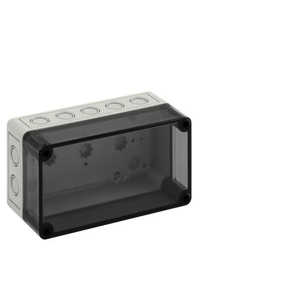 m = metrisch, o = ohne Vorprägung Leergehäuse, mit Schutzart IP66, Polystyrol, Ui=690V AC, Ui=1000V DC, innenliegende Befestigungsstellen, für Standardinstallationen im Innenbereich, Kasten: Polystyrol, grau, Deckel: Polycarbonat, transparent, Ausschlagmembranen, M16/M20, (14 seitlich)