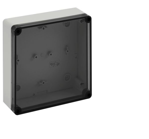m = metrisch, o = ohne Vorprägung Leergehäuse, mit Schutzart IP66, Polystyrol, Ui=690V AC, Ui=1000V DC, innenliegende Befestigungsstellen, für Standardinstallationen im Innenbereich, Kasten: Polystyrol, grau, Deckel: Polycarbonat, transparent, glatte Seitenwände