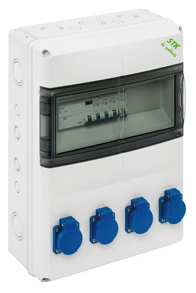 Steckdosenkombination, mit Schutzart IP44, anschlussfertig nach EN61439-3, mit zentraler Anschlussklemme 4-25mm², 5-polig, auch geeignet zum Durchschleifen der Zuleitung, werkzeuglos entnehmbare Normschienen zur einfachen Leitungsverlegung im Gehäuse, CEE-Steckdosen mit 20°Neigung, einfache Kombination mit STK-Zusatzgehäusen oder AK Air Verteilern mit Flanschöffnungen (AK-F), inkl. Flansche, verfügbare Teilungseinheiten: 14