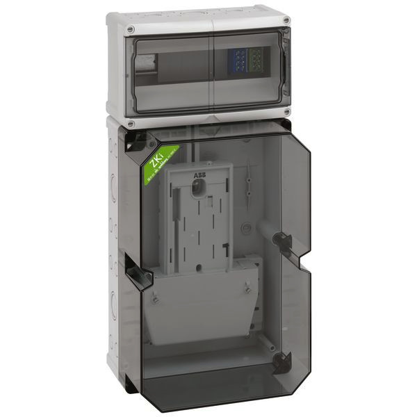 mit transparentem Deckel, serienmäßig plombierbar, mit montierter BKE-A für den elektronischen Haushaltszähler, serienmäßig plombierbarer Konsumentenraum oben, mit 35 mm Normschiene und PE/N-Doppelklemmen, mit IP54 Anbaustutzen, Verschluss- und Isolierstopfen