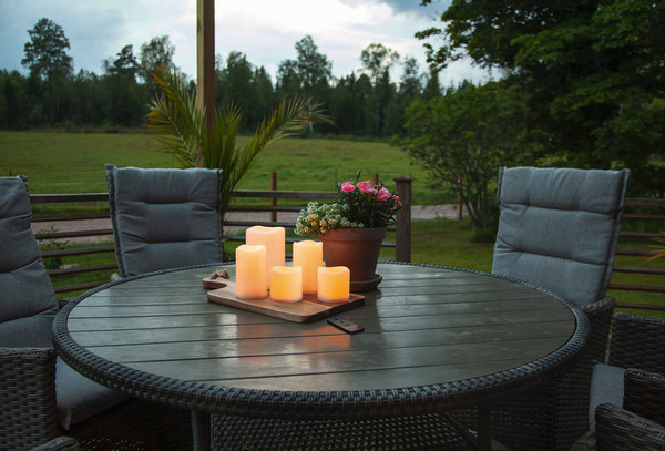 Led-Kerzen im 5er-Pack für den Außen- und Innenbereich geeignet. Die Kerzen leuchten mit je einer warmweißen LED und mit der mitgelieferten Fernbedienung können Sie die Kerzen einfach bedienen. Die Größe für die Kerzen: 2pcs 75x75mm. 2Stück 75x120mm. 1Stück 100x150mm