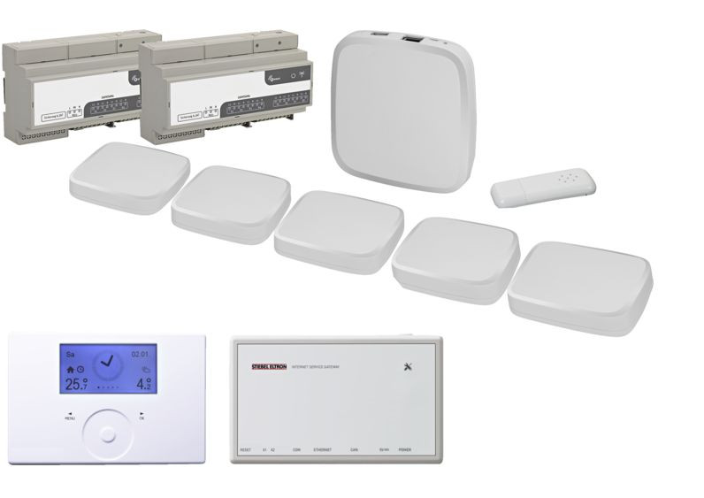 Das optimierte Set aus Regelungskomponenten für die schnelle Anbindung der Flächenkühlung in die Heizungsanlage. Das Set besteht aus einer EASYTRON Zentrale, 2 Funkcontrollern, 5 Funkraumsensoren sowie einer kabelgebundenen Raumfernbedienung zur Taupunktüberwachung. Durch das Ethernet Gateway ISG Web ist eine Anbindung der Wärmepumpen in das Netzwerk möglich. Dank der funkbasierten Einzelraumregelung lassen sich die Raumtemperatursensoren sowie bestehende 230V NC Stellantriebe der Fußbodenheizung einfach und sicher anschließen.