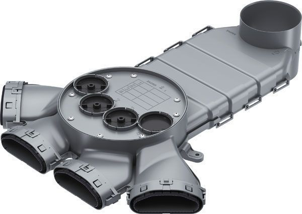 Beschreibung • Der Luftverteiler bietet vier verschiedene Anschlussmöglichkeiten für den flexiblen Luftkanal und den Hauptanschluss. • Der Verteiler aus korrosionsbeständigem, geruchsneutralem Kunststoff ist mit einem abnehmbaren Revisionsdeckel ausgestattet. Dadurch ist der Zugriff auf die verschiedenen Einstellmöglichkeiten für den Luftvolumenstrom der Auslässe sichergestellt.