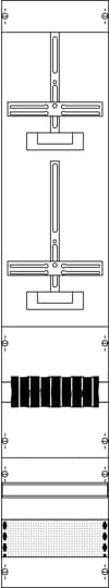 Messfeld, Komplettfeld, mit Zählerkreuz, für den Innenbereich, geltende Normen: DIN EN 61439-1, VDE 0660-600-1, Abmessungen in mm (H x B x T): 1350 x 250 x 160, Anzahl Zählerplätze Einzeltarif 1, Anzahl SG-Plätze 1, Anzahl Wandlerzählerplatz 1, inkl. Prüfklemme nach Vorgabe NB, Zwischenklemmbereich nach TAB A.5 im Zugang verdrahtet, Hinweis: Wandleranlagen sind in einem separaten Gehäuse einzubauen, Rasteinheit 9 RE, Bauhöhe 5, Feldbreite 1, Platzeinheiten 108, Abdeckungen aus Kunststoff, plombierbarer Schnellverschluss, RAL 7035