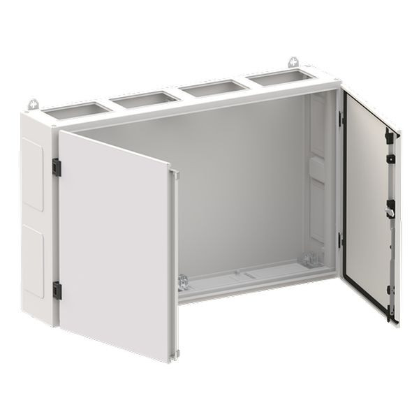 Wandschrank, Baureihe TwinLine, Leerschrank, Montageart: Aufputz, teilversenkt, für den Innenbereich, mit Tür, Schutzklasse II (schutzisoliert), Schutzart IP55, geltende Normen: DIN EN 61439-1, VDE 0660-600-1, DIN EN 61439-2, VDE 0660-600-2, DIN EN 61439-3, VDE 0660-600-3, IK-Code 08, pulverbeschichtet, in RAL 7035, Gehäuse aus Stahlblech, Doppeltür, Tür aus Stahlblech, mit Standardverschluss Doppelbart 3 mm, Türöffnungswinkel 180 Grad, Türanschlag rechts und links, Rückwand aus Stahlblech, Leitungseinführung oben über Flanschöffnung ausgeschnitten, unten über Flanschöffnung vorgeprägt, seitlich über Flanschöffnung vorgeprägt, Abmessungen in mm (H x B x T): 650 x 1050 x 225, Rasteinheit 4 RE, Bauhöhe 0, Feldbreite 4, Platzeinheiten 192, vorbereitet für den Ausbau mit Zähler-, Verteilerfelder, Kombi-Sets, CombiLine-Module auf EDF-/WR-Montagegerüst