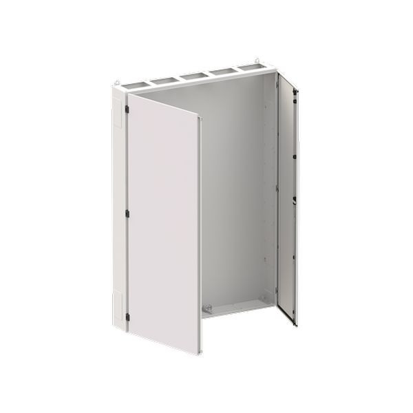 Standschrank, Baureihe TwinLine, Leerschrank, Montageart: Aufputz, teilversenkt, für den Innenbereich, mit Tür, Schutzklasse I (geerdet), Schutzart IP55, geltende Normen: DIN EN 61439-1, VDE 0660-600-1, DIN EN 61439-2, VDE 0660-600-2, DIN EN 61439-3, VDE 0660-600-3, IK-Code 08, pulverbeschichtet, in RAL 7035, Gehäuse aus Stahlblech, Doppeltür, Tür aus Stahlblech, mit Standardverschluss Doppelbart 3 mm, Türöffnungswinkel 180 Grad, Türanschlag rechts und links, Rückwand aus Stahlblech, Leitungseinführung oben über Flanschöffnung ausgeschnitten, unten über Flanschöffnung vorgeprägt, seitlich über Flanschöffnung vorgeprägt, Abmessungen in mm (H x B x T): 1850 x 1300 x 225, Rasteinheit 12 RE, Bauhöhe 8, Feldbreite 5, Platzeinheiten 720, vorbereitet für den Ausbau mit Zähler-, Verteilerfelder, Kombi-Sets, CombiLine-Module oder Montageplatten auf EDF-/WR-Montagegerüst