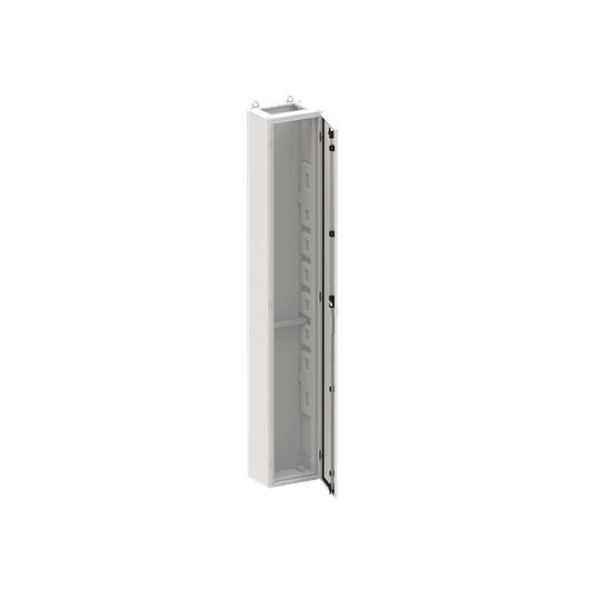 Standschrank, Baureihe TwinLine, Leerschrank, Montageart: Aufputz, teilversenkt, für den Innenbereich, mit Tür, Schutzklasse II (schutzisoliert), Schutzart IP44, geltende Normen: DIN EN 61439-1, VDE 0660-600-1, IK-Code 08, pulverbeschichtet, in RAL 7035, Gehäuse aus Stahlblech, einflüglige Tür, Tür aus Stahlblech, mit Standardverschluss Doppelbart 3 mm, Türöffnungswinkel 180 Grad, Türanschlag rechts oder links, Rückwand aus Stahlblech, Leitungseinführung oben über Flanschöffnung ausgeschnitten, unten über Flanschöffnung vorgeprägt, Abmessungen in mm (H x B x T): 1850 x 300 x 225, Rasteinheit 12 RE, Bauhöhe 8, Feldbreite 1, Platzeinheiten 144, vorbereitet zum Einbau von Verteilerfeldern und CombiLine Modulsystemfeldern