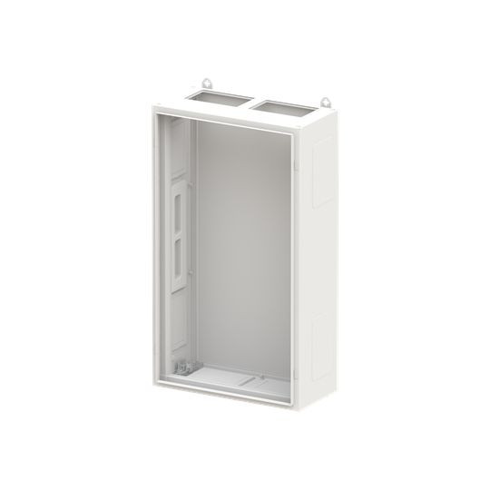 Wandschrank, Baureihe TwinLine, Leerschrank, Montageart: Aufputz, teilversenkt, für den Innenbereich, ohne Tür, Schutzklasse II (schutzisoliert), Schutzart IP30, geltende Normen: DIN EN 61439-1, VDE 0660-600-1, DIN EN 61439-2, VDE 0660-600-2, DIN EN 61439-3, VDE 0660-600-3, IK-Code 08, pulverbeschichtet, in RAL 7035, Gehäuse aus Stahlblech, ohne Tür, Rückwand aus Stahlblech, Leitungseinführung oben über Flanschöffnung ausgeschnitten, unten über Flanschöffnung vorgeprägt, seitlich über Flanschöffnung vorgeprägt, Abmessungen in mm (H x B x T): 950 x 550 x 275, Rasteinheit 6 RE, Bauhöhe 2, Feldbreite 2, Platzeinheiten 144, vorbereitet für den Ausbau mit Zähler-, Verteilerfelder, Kombi-Sets, CombiLine-Module auf EDF-/WR-Montagegerüst