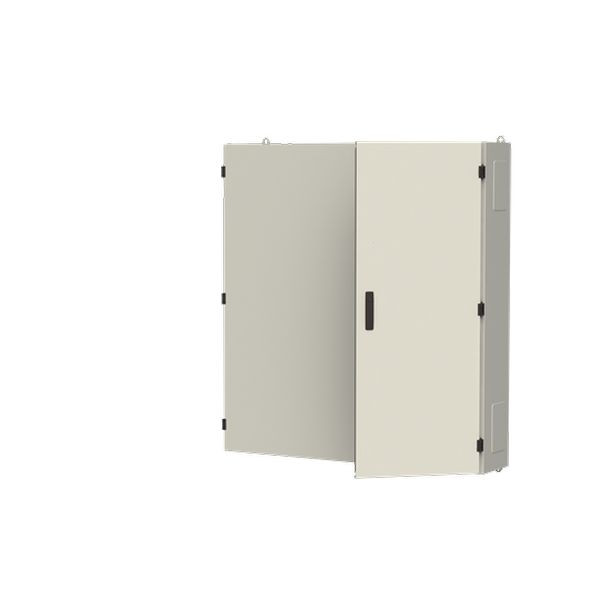Wandschrank, Baureihe TwinLine, Leerschrank, Montageart: Aufputz, teilversenkt, für den Innenbereich, mit Tür, Schutzklasse II (schutzisoliert), Schutzart IP55, geltende Normen: DIN EN 61439-1, VDE 0660-600-1, DIN EN 61439-2, VDE 0660-600-2, DIN EN 61439-3, VDE 0660-600-3, IK-Code 08, pulverbeschichtet, in RAL 7035, Gehäuse aus Stahlblech, Doppeltür, Tür aus Stahlblech, mit Standardverschluss Doppelbart 3 mm, Türöffnungswinkel 180 Grad, Türanschlag rechts und links, Rückwand aus Stahlblech, Leitungseinführung oben über Flanschöffnung ausgeschnitten, unten über Flanschöffnung vorgeprägt, seitlich über Flanschöffnung vorgeprägt, Abmessungen in mm (H x B x T): 1400 x 1300 x 275, Rasteinheit 9 RE, Bauhöhe 5, Feldbreite 5, Platzeinheiten 540, vorbereitet für den Ausbau mit Zähler-, Verteilerfelder, Kombi-Sets, CombiLine-Module auf EDF-/WR-Montagegerüst