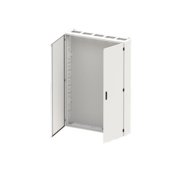 Standschrank, Baureihe TwinLine, Leerschrank, Montageart: Aufputz, teilversenkt, für den Innenbereich, mit Tür, Schutzklasse II (schutzisoliert), Schutzart IP55, geltende Normen: DIN EN 61439-1, VDE 0660-600-1, DIN EN 61439-2, VDE 0660-600-2, DIN EN 61439-3, VDE 0660-600-3, IK-Code 08, pulverbeschichtet, in RAL 7035, Gehäuse aus Stahlblech, Doppeltür, Tür aus Stahlblech, mit Standardverschluss Doppelbart 3 mm, Türöffnungswinkel 180 Grad, Türanschlag rechts und links, Rückwand aus Stahlblech, Leitungseinführung oben über Flanschöffnung ausgeschnitten, unten über Flanschöffnung vorgeprägt, seitlich über Flanschöffnung vorgeprägt, Abmessungen in mm (H x B x T): 1850 x 1300 x 275, Rasteinheit 12 RE, Bauhöhe 8, Feldbreite 5, Platzeinheiten 720, vorbereitet für den Ausbau mit Zähler-, Verteilerfelder, Kombi-Sets, CombiLine-Module auf EDF-/WR-Montagegerüst