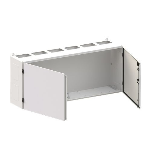 Wandschrank, Baureihe TwinLine, Leerschrank, Montageart: Aufputz, teilversenkt, für den Innenbereich, mit Tür, Schutzklasse I (geerdet), Schutzart IP55, geltende Normen: DIN EN 61439-1, VDE 0660-600-1, IK-Code 08, pulverbeschichtet, in RAL 7035, Gehäuse aus Stahlblech, Doppeltür, Tür aus Stahlblech, mit Standardverschluss Doppelbart 3 mm, Türöffnungswinkel 180 Grad, Türanschlag rechts und links, Rückwand aus Stahlblech, Leitungseinführung oben über Flanschöffnung ausgeschnitten, unten über Flanschöffnung vorgeprägt, seitlich über Flanschöffnung vorgeprägt, Abmessungen in mm (H x B x T): 650 x 1550 x 350, Rasteinheit 4 RE, Bauhöhe 0, Feldbreite 6, Platzeinheiten 288, vorbereitet für den Ausbau mit Zähler-, Verteilerfelder, Kombi-Sets, CombiLine-Module oder Montageplatten auf EDF-/WR-Montagegerüst