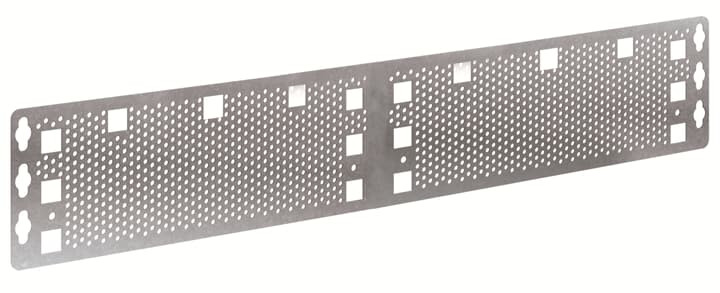 Lochblech Montageplatte aus verzinktem Stahlblech, passend zu UK600, mit Stanzungen zur aufnahme von Drahthaltern und Gerätehalter Clips, Montageplattenmaße H x B in mm 86 x 494.