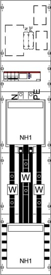 Wandlerfeld für EEG, Komplettfeld, für den Innenbereich, Schutzart IP2XC, geltende Normen: DIN EN 61439-1, VDE 0660-600-1, DIN EN 61439-2, VDE 0660-600-2, Bemessungsbetriebsspannung Ue 415V AC 50/60 Hz, Bemessungsstrom In 115 A, Bemessungsstrom der Schaltgerätekombination InA 115 A, in RAL 7035, Abmessungen in mm (H x B x T): 1350 x 250 x 160, Netzsystem TN-S, 5-polig, Lastbereich: Sammelschienensystem Cu-Schienen 12 x 5 mm 5-polig, Trennstelle vor dem Wandler Trenner NH1/250 A, Wandlerbereich Wandlerauflage mit herausnehmbarer Wandlerlasche 170 x 30 x 5 mm, Ritz: EKS 60-03, EKS 70-04, EKSO 74, MBS: EASK 31.3, EASK 31.4, EASK 31.5, EASK 41.4, EASK 41.5 (Beistellung NB), Trennstelle nach dem Wandler NA-Schutz mit AF116 Schütz, Primärverdrahtung L1-L3 Cu-Schiene 30 x 5 und 20 x 5, PE+N Cu-Schiene 20 x 5 mm, Anschluss N+PE (M8), Rasteinheit 9 RE, Bauhöhe 5, Feldbreite 1, Platzeinheiten 108, Abdeckungen aus Kunststoff, plombierbarer Schnellverschluss, RAL 7035