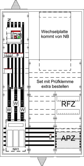 Mess- und Wandler Komplettschrank. Bemessungsbetriebsspannung Ue 415 V AC 50/60 Hz, Bemessungsstrom der Schaltgerätekombination InA 200 A, Abmessungen in mm (H x B x T): 1400 x 800 x 225, Netzsystem TN-S, 5-polig, Netzseitiger Anschlussraum Zählerplatz: mit Sammelschiene, Zählerwechselplatte Zählerwechseltafel Größe 1/2 oder 2 (KF421, KF414), Lastbereich: Sammelschienensystem Cu-Schienen 12 x 5 mm 5-polig, Trennstelle vor dem Wandler Sicherungslasttrenner NH1/250 A, Wandlerbereich Wandlerauflage mit herausnehmbarer Wandlerlasche 170 x 30 x 5 mm, Ritz: EKS 60-03, EKS 70-04, EKSO 74, MBS: EASK 31.3, EASK 31.4, EASK 31.5, EASK 41.4, EASK 41.5 (Beistellung NB), Trennstelle nach dem Wandler Lastschalter 250 A / 3-polig (M8), Primärverdrahtung L1-L3 Cu-Schiene 30 x 5 mm und 20 x 5 mm , PE+N Cu-Schiene 20 x 5 mm, Anschluss N+PE (M8), Hinweis: Zählerwechselplatte KF414 erforderlich, Sammelschienenanschlussklemmen extra bestellen, Rasteinheit 9 RE, Bauhöhe 5, Feldbreite 3, Platzeinheiten 324, Abdeckungen aus Kunststoff, plombierbarer Schnellverschluss, RAL 7035, vorbereitet zum Einbau einer Zählerwechselplatte