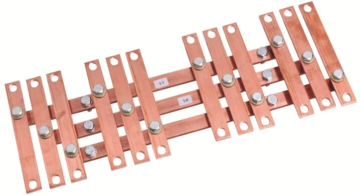 Sammelschienen als Sammelschienensystem, E-Cu nach DIN 43673-1, Abmessungen: 20 x 5 mm, mit einer Länge von 410 mm, Abmessungen: 20 x 5 mm, Schraubenanschluss M8, für einen Bemessungsstrom von 320 A, 3-polig, Verpackungseinheit 1 Stück