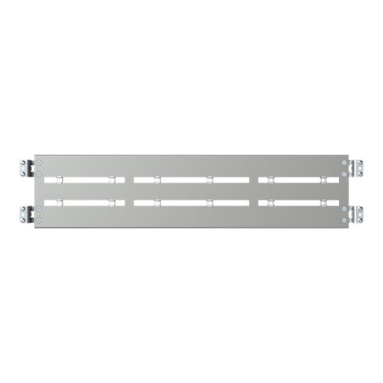 Montagetraverse für Trennerbefestigung, 3-feldbreit, für 3 Trenne NH1 oder NH2, Universalmontage auf Gleitschienentechnik zur Anpassung unterschiedlicher Befestigungsbohrungen, mit Befestigungsschrauben und Käfigmuttern M8, passend für M(B)T345(B), M(B)T343(B), M(B)T344(B), M(B)T345(B).