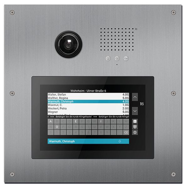 Touchdisplay mit 30,48 cm (12 Zoll) Diagonale, Frontplatte aus geschliffenem Edelstahl, Für Unterputz, Für bis zu 1000 Rufziele, Bewohnernamen lokal oder per Fernzugriff (via LAN) verwalten, Optional Funktionsmodule aus der Serie AMI, Display-Eigenschaften: Displaygröße: 30,48 cm (12 Zoll) Diagonale, Displayart: kapazitiver Touchdisplay, color, Geräteeigenschaften: Außenstationsserie mit Touchscreen, Montageform: Aufputzmontage / Unterputzmontage, Material Gehäuse: Edelstahl, Lautstärke Sprachausgabe: einstellbar, Lautstärke Mikrofonempfindlichkeit: einstellbar, Gesprächszeit: einstellbar, Türöffnerzeit / Türbereitschaftszeit: einstellbar, Dome Kamera, Einbau-Türlautsprecher, barrierefrei, Softwareeigenschaften: Sortierfunktion: Bewohnersuche über Namen oder Wohnungsnummer, Bedienerführung: mehrsprachig, Anzahl Rufziele: für bis zu 1.000 Wohneinheiten, modulare Erweiterungen: Zutrittskontrolle, Video, Pförtnerruf, Postschloss, Durchsagefunktionalität, Einblenden von Zusatzinformationen: Besuchszeiten, Lagepläne, Werbung, Codeschlossfunktion: 6 Codes für alle Anwender, zusätzlich ein individueller Code je Bewohner, Bewohnernamen verwalten: lokal oder per Fernzugriff (via LAN), Technische Daten: Technologie: 2-Draht-TCS:BUS, Versorgungsspannung: 24 V, zulässige Umgebungstemperatur: -20 bis +55 Grad C, UV-Beständigkeit: direkte Sonneinstrahlung vermeiden