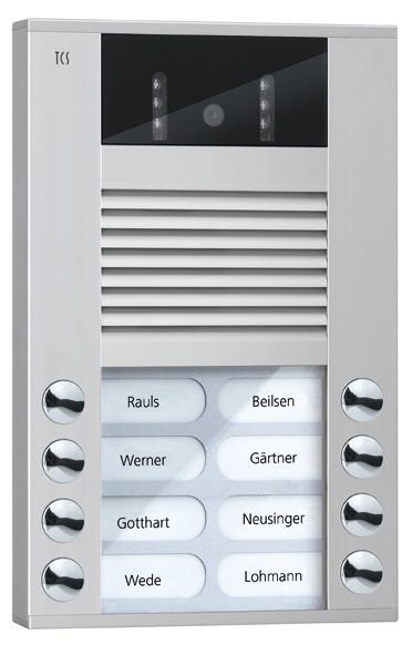 für 8 Wohneinheiten, Kamerafeld: H 38 mm x B 82 mm, color-Kamera CMOS-Sensor 380 TVL, IR-Beleuchtung für Nahfeldausleuchtung, automatische Tag / Nachtumschaltung, Brennweite: f = 2,0 mm (F2,5), Lichtempfindlichkeit 0 Lux (IR ON), 1 Lux (IR OFF), diagonaler Erfassungswinkel in 130 Grad, empfohlene Montagehöhe für die Kameraposition 1,6 m, Videoausgang symmetrisch 1 Vss FBAS, basiert auf dem TCS-Videosystem in 6-Draht-Technik, Eingangsstrom: I(a) = 0,4 mA, I(P) = 60 mA in Ruhe, maximaler Eingangsstrom: I(Pmax) = 80 mA, zulässige Umgebungstemperatur: -20 Grad C bis 50 Grad C, Farbe: Aluminium eloxiert natur, Maße: H 204 mm x B 135 mm x T 20 mm