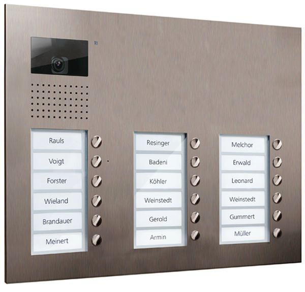 | Kurzbeschreibung | Video Außenstation Serie AVU mit 18 Klingeltasten (rechtsbündig), 3-spaltig, UP Edelstahl |