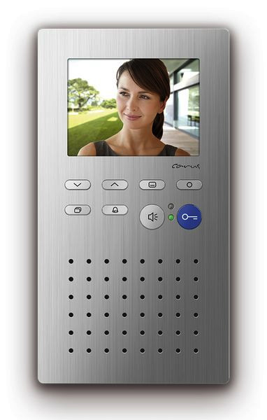 Carus Origo Video-Innenstation, Gehäuse aus massivem Aluminium, handveredelte Strukturoberfläche, Farbe: Silber, Tasten aus poliertem, eloxiertem Aluminium, laserbeschriftet, TFT-Display Bildschirmdiagonale 8,9cm (3,5 Zoll), Auflösung color: 320 x 240 Pixel, Aufputzmontage, Freisprechen (hands-free) / manuell gesteuertes Wechselsprechen aktivierbar, blaue Türöffnertaste, Taste für Rufannahme bzw. Umschalttaste Sprechen / Hören, wenn Wechselsprechen aktiviert, 1 Funktionstaste mit optischer Anzeige, ab Werk: mit Steuerfunktion belegt aktivierbare Alternativbelegung: Internruf, Türöffnerautomatik, Rufumleitung, Licht / mit configo einstellbar, Bildtaste zum Einschalten des Bildes bzw. zum Umschalten zwischen verschiedenen Kameras, Menütaste zur Aktivierung, Steuerung des OSD Menü, 2 Cursortasten zur OSD Navigation und Einstellung, Auswahl aus 13 polyphonen Ruftönen, über OSD einstellbar, akustische und optische Rufunterscheidung zwischen Haus-, Wohnungstür und Internruf, akustische Türrufunterscheidung je Klingeltaste, 4 unterschiedliche Ruftöne, akustische Türrufunterscheidung für 2 Türen, Ruftonabschaltung mit optischer Anzeige, OSD basierte Auslösung von max. 10 Internrufen und max. 10 Steuerfunktionen mit Bezeichnung / mit configo einstellbar, OSD basierte Bedienung des zentralen Bildspeichers (FVM1000), Ruftonlautstärke in 4 Stufen über OSD einstellbar, Sprechenlautstärke in 8 Stufen über OSD einstellbar, Helligkeit, Kontrast, Farbsättigung über OSD einstellbar, 1 Parallelruf / mit configo aktivierbar, Empfang und Anzeige von max. 10 Kurzmitteilungen, optische Anzeige für neu aufgezeichnete Bilder im zentralen Bildspeicher (FVM1000), optische Kurzzeitspeicherung von Türrufen, optische Besetztanzeige bei bestehender Sprechverbindung, optische Anzeige ungelesener Kurzmitteilungen, Anschluss für Etagentaster am Gerät vorhanden, Mithörsperre und automatische Gesprächsabschaltung, Audio- und Video-Innenstationen sind innerhalb einer Anlage kombinierbar, basiert auf dem TCS-Videosystem in 6-Draht-Technik, Eingangsstrom: I(a) = 0,04 mA, I(P) = 8 mA in Ruhe, maximaler Eingangsstrom: I(Pmax) = 175 mA, zulässige Umgebungstemperatur: -5 Grad C bis 40 Grad C, geprüft nach EN 50486, Gehäusemaß: H 186 mm x B 101 mm x T 20 mm, Montagemaß: H 250 mm x B 101 mm x T 22 mm