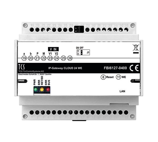 Das IP-Gateway CLOUD 24WE ist ein vorkonfiguriertes IP-Gateway, um die mobile Türkommunikation (snipdoo® HOME-App) in eine TCS:BUS-Anlage einzubinden. Das IP-Gateway CLOUD 24WE enthält vorkonfigurierte Einstellungen für 1 Video-Außenstation TCS:BUS und für bis zu max. 24 Audio- und/oder Video-Innenstationen TCS:BUS. Die Lizenzen für 24 snipdoo® HOME-Apps sind für 5 Jahre inklusive. Die Gültigkeit beginnt ab dem ersten Scannen des QR-Codes auf der Weboberfläche des IP-Gateway CLOUD 24WE. Ein Zugang zur snipdoo® CLOUD wird nicht benötigt. Das Gerät ist für die Montage auf einer Hutschiene (DIN EN 60715:2001-09) mit 6 TE im Schaltschrank vorgesehen, Zur Einrichtung des FBI6126-0400 ist ein externes Gerät (z.B. Laptop) erforderlich, Zur Rufweiterleitung an Mobiltelefone (snipdoo® HOME-App), Vorgesehen für eine Außenstation und 24 Innenstationen, Vorkonfiguriert – kein manuelles Anlegen von Accounts in der snipdoo® CLOUD notwendig, Integriertes Webinterface zur einfachen und schnellen Inbetriebnahme, Mehrsprachiges Webinterface: Deutsch und Englisch, 24 snipdoo® HOME Lizenzen für 5 Jahre enthalten, Bildspeicher, Voraussetzungen: TCS:BUS Sprechanlage, Router mit Internetverbindung (6 Mbit Upload), DHCP – werksseitig aktiviert, Optische Status- und Fehleranzeige über LEDs, Maße: 105mm x 90mm x 70mm (BxHxT), Montageform: Hutschiene, Bauform: Reiheneinbaugehäuse (6TE), Spannungsversorgung: TCS:BUS 6-Draht, Stromaufnahme maximal (mA): 250, Schnittstellen: LAN (RJ45, IEEE802.3u 10/100BASE-Tx/s, Auto MDIX), Schraubklemmen, Betriebstemperatur: 0°C bis 40°C, Schutzart Gehäuse: IP20, Audo-Codecs: G.711a/µ, G.722, GSM6.1, iLBC, Speex.Audio-Übertragung: Halb-Duplex, Video-Codecs: MJPEG, JPEG, h.264, Video-Übertragung: HTTP, RTP, Videoauflösung Analog-Digital: 320x240, 640x480, Unterstütze Protokolle: IPv4, TCP, UDP, DHCP, HTTP, SIP 2.0 (UDP / TCP), RTP, SNTP, Syslog, ICMP, ARP