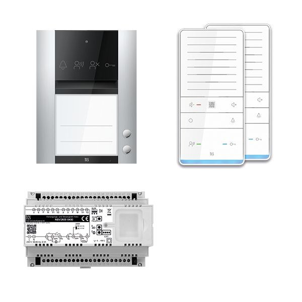 Vorkonfiguriertes Paket für 2 Wohneinheiten für den TCS:BUS bestehend aus: 1x PES PRO Audio Außenstation 2T AP EN, Artikelnummer: ASA110102-0010, vorprogrammiert, 2x TASTA Freisprecher AUDIO PLUS WS SDI, Artikelnummer: ISW6031-0145, 1x Versorgungs- und Steuergerät Video 8 TE, Artikelnummer: NBV2600-0400, das Paket ist ab Werk vorkonfiguriert und bedingt erweiterbar. Die Funktionen der Innen- und Außenstationen können mit TCS-Serviceprodukten bedingt verändert werden.