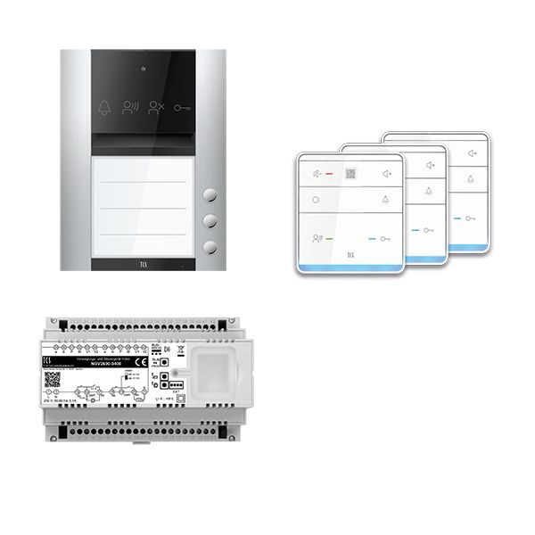 Vorkonfiguriertes Paket für 3 Wohneinheiten für den TCS:BUS bestehend aus: 1x PES PRO Audio Außenstation 3T AP EN, Artikelnummer: ASA110103-0010, vorprogrammiert, 3x TASTA Freisprecher 6Tasten AP WS SDI, Artikelnummer: ISW6010-0145, 1x Versorgungs- und Steuergerät Video 8 TE, Artikelnummer: NBV2600-0400. Das Paket ist ab Werk vorkonfiguriert und bedingt erweiterbar. Die Funktionen der Innen- und Außenstationen können mit TCS-Serviceprodukten bedingt verändert werden.