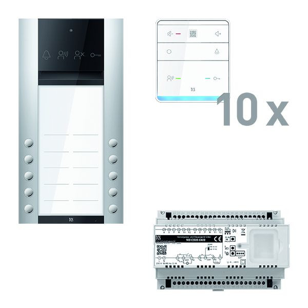 Vorkonfiguriertes Paket für 10 Wohneinheiten für den TCS:BUS bestehend aus: 1x PES PRO Audio Außenstation 10T AP EN, Artikelnummer: ASA120210-0010, vorprogrammiert, 10x TASTA Freisprecher 6Tasten AP WS SDI, Artikelnummer: ISW6010-0145, 1x Versorgungs- und Steuergerät Video 8 TE, Artikelnummer: NBV2600-0400. Das Paket ist ab Werk vorkonfiguriert und bedingt erweiterbar. Die Funktionen der Innen- und Außenstationen können mit TCS-Serviceprodukten bedingt verändert werden.