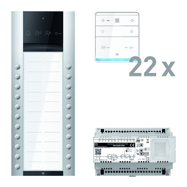 Vorkonfiguriertes Paket für 22 Wohneinheiten für den TCS:BUS bestehend aus: 1x PES PRO Audio Außenstation 22T AP EN, Artikelnummer: ASA130222-0010, vorprogrammiert, 22x TASTA Freisprecher 6Tasten AP WS SDI, Artikelnummer: ISW6010-0145, 1x Versorgungs- und Steuergerät Video 8 TE, Artikelnummer: NBV2600-0400. Das Paket ist ab Werk vorkonfiguriert und bedingt erweiterbar. Die Funktionen der Innen- und Außenstationen können mit TCS-Serviceprodukten bedingt verändert werden.
