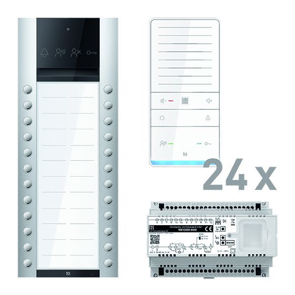 Vorkonfiguriertes Paket für 24 Wohneinheiten für den TCS:BUS bestehend aus: 1x PES PRO Audio Außenstation 24T AP EN, Artikelnummer: ASA110224-0010, vorprogrammiert, 24x TASTA Freisprecher AUDIO PLUS WS SDI, Artikelnummer: ISW6031-0145, 1x Versorgungs- und Steuergerät Video 8 TE, Artikelnummer: NBV2600-0400, das Paket ist ab Werk vorkonfiguriert und bedingt erweiterbar. Die Funktionen der Innen- und Außenstationen können mit TCS-Serviceprodukten bedingt verändert werden.