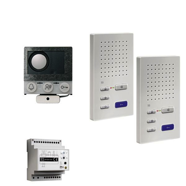 Vorkonfiguriertes Paket für 2 Wohneinheiten für den TCS:BUS bestehend aus: 1x Einbau-Türlautsprecher (Serie TCU) 16WE, Artikelnummer: ASI12000-0000, vorprogrammiert, 2x Innenstation zum Freispr. 5Tasten WS, Artikelnummer: ISW3030-0140, 1x Vers. + Steuerg. BVS20 1Strang 4TE, Artikelnummer: BVS20-SG, Das Paket ist ab Werk vorkonfiguriert und bedingt erweiterbar, Die Funktionen der Innen- und Außenstationen können mit TCS-Serviceprodukten bedingt verändert werden, Die Komponenten unterstützen einen stand-alone-Betrieb