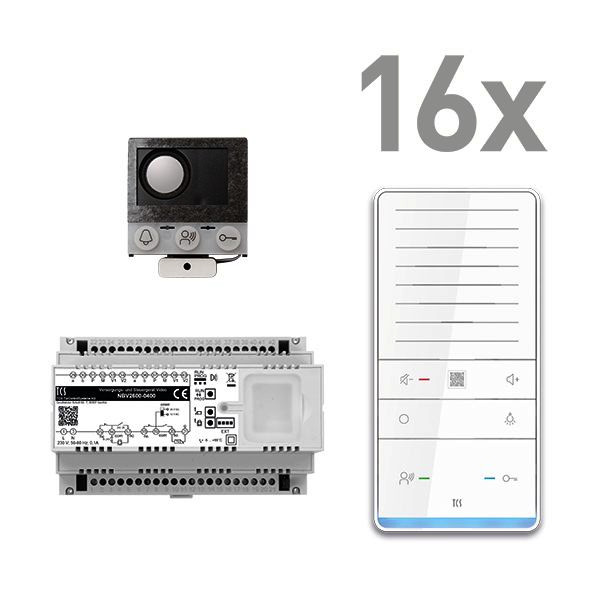 Vorkonfiguriertes Paket für 16 Wohneinheit für den TCS:BUS bestehend aus: 1x Einbau-Türlautsprecher (Serie TCU) 16WE, Artikelnummer: ASI12000-0000, vorprogrammiert, 16x TASTA PRO Freisprecher PLUS WS SDI, Artikelnummer: ISW6031-0145, 1x Versorgungs- und Steuergerät Video 8 TE, Artikelnummer: NBV2600-0400. Das Paket ist ab Werk vorkonfiguriert und bedingt erweiterbar. Die Funktionen der Innen- und Außenstationen können mit TCS-Serviceprodukten bedingt verändert werden. Die Komponenten unterstützen einen stand-alone-Betrieb.