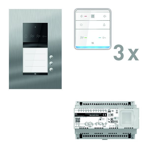Vorkonfiguriertes Paket für 3 Wohneinheiten für den TCS:BUS bestehend aus: 1x PES PRO Audio Außenstation 3T UP ES Artikelnummer: ASU600103-0030, vorprogrammiert, 3x TASTA PRO Freisprecher 6Tasten AP WS SDI, Artikelnummer: ISW6010-0145, 1x Versorgungs- und Steuergerät Video 8 TE, Artikel-Nr. NBV2600-0400. Das Paket ist ab Werk vorkonfiguriert und bedingt erweiterbar. Die Funktionen der Innen- und Außenstationen können mit TCS-Serviceprodukten bedingt verändert werden
