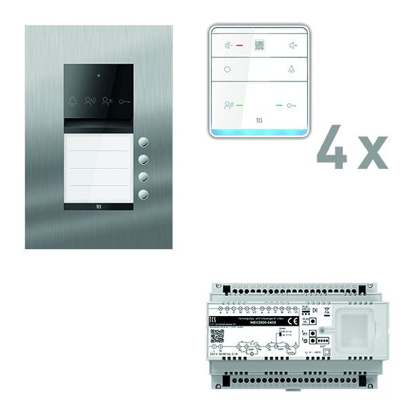 Vorkonfiguriertes Paket für 4 Wohneinheiten für den TCS:BUS bestehend aus: 1x PES PRO Audio Außenstation 4T UP ES Artikelnummer: ASU600104-0030, vorprogrammiert, 4x TASTA PRO Freisprecher 6Tasten AP WS SDI, Artikelnummer: ISW6010-0145, 1x Versorgungs- und Steuergerät Video 8 TE, Artikel-Nr. NBV2600-0400. Das Paket ist ab Werk vorkonfiguriert und bedingt erweiterbar. Die Funktionen der Innen- und Außenstationen können mit TCS-Serviceprodukten bedingt verändert werden