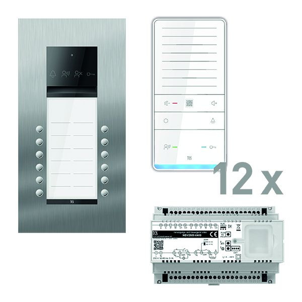 Vorkonfiguriertes Paket für 12 Wohneinheiten für den TCS:BUS bestehend aus: 1x PES PRO Audio Außenstation 12T UP ES, Artikelnummer: ASU600212-0030, vorprogrammiert, 12x TASTA Pro Freisprecher PLUS WS SDI, Artikelnummer: ISW6031-0145, 1x Versorgungs- und Steuergerät Video 8 TE, Artikel-Nr. NBV2600-0400. Das Paket ist ab Werk vorkonfiguriert und bedingt erweiterbar. Die Funktionen der Innen- und Außenstationen können mit TCS-Serviceprodukten bedingt verändert werden