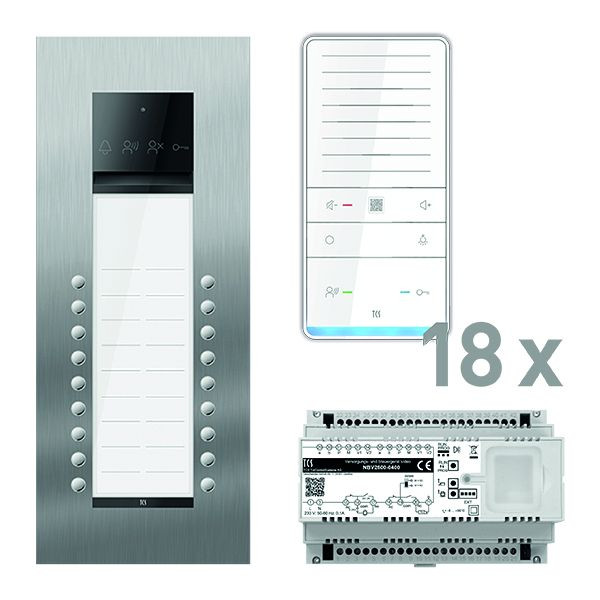 Vorkonfiguriertes Paket für 18 Wohneinheiten für den TCS:BUS bestehend aus: 1x PES PRO Audio Außenstation 18T UP ES, Artikelnummer: ASU600218-0030, vorprogrammiert, 18x TASTA Pro Freisprecher PLUS WS SDI, Artikelnummer: ISW6031-0145, 1x Versorgungs- und Steuergerät Video 8 TE, Artikel-Nr. NBV2600-0400. Das Paket ist ab Werk vorkonfiguriert und bedingt erweiterbar. Die Funktionen der Innen- und Außenstationen können mit TCS-Serviceprodukten bedingt verändert werden