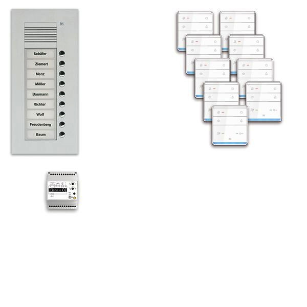 Vorkonfiguriertes Paket für 9 Wohneinheiten für den TCS:BUS bestehend aus: 1x Außenstation PUK 9Tasten 1Spalte UP EN, Artikelnummer: PUK09/1-EN, vorprogrammiert, 9x TASTA Freisprecher 6Tasten AP WS, Artikelnummer: ISW6010-0145, 1x Vers. + Steuerg. BVS20 1Strang 4TE, Artikelnummer: BVS20-SG, Das Paket ist ab Werk vorkonfiguriert und bedingt erweiterbar, Die Funktionen der Innen- und Außenstationen können mit TCS-Serviceprodukten bedingt verändert werden, Die Komponenten unterstützen einen stand-alone-Betrieb