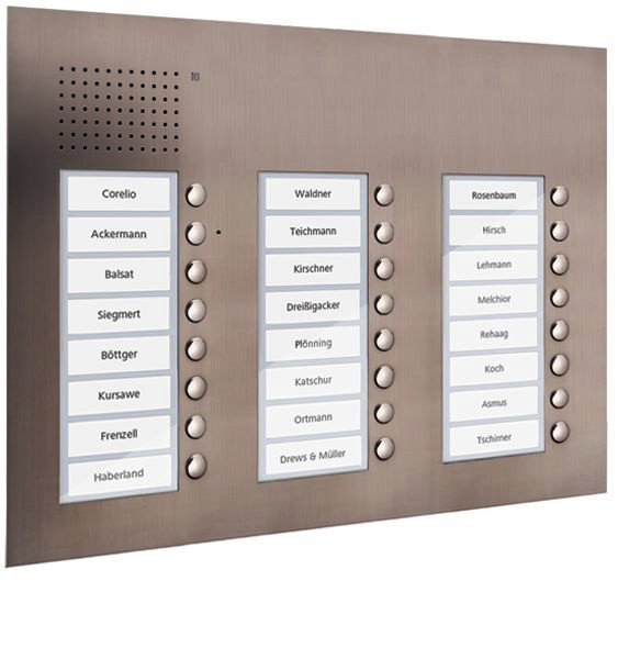 für 24 Wohneinheiten, Unterputzmontage, Frontplatte 3 mm, win:clip-Prinzip, Namensfeldgröße: H 19 mm x B 62 mm, Metallklingelknöpfe mit vergoldeten, wartungsfreien Kontakten, langlebige und energiesparende Namens- / Infoschildbeleuchtung, bruchsicheres Namensschildglas, Quittungston beim Drücken der Klingeltaste, Sprechgitter gelocht, Frontplatte: Edelstahl geschliffen, 3-Draht-Technik erforderlich, zulässige Umgebungstemperatur: -20 Grad C bis 50 Grad C, Maße Frontplatte: H 296 mm x B 398 mm x T 3 mm, Maße UP-Kasten: H 247 mm x B 374 mm x T 40 mm