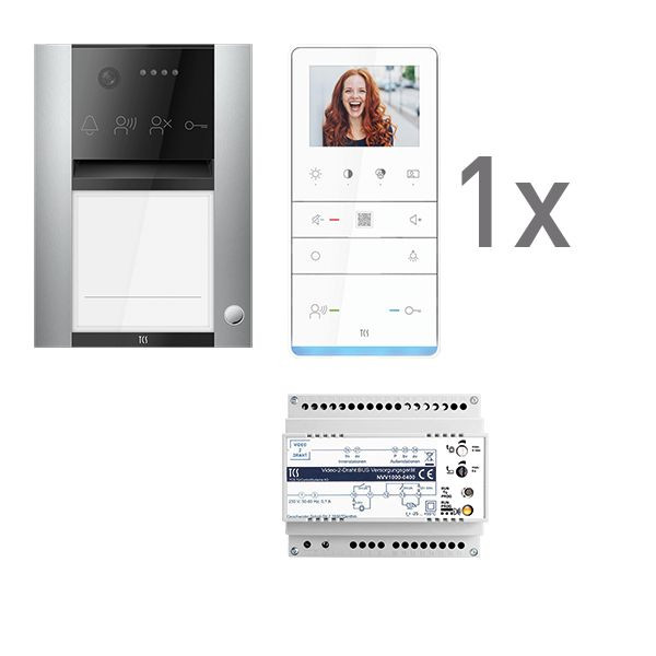 Vorkonfiguriertes Video Paket für 1 Wohneinheit für den TCS:BUS bestehend aus: 1x PES PRO Video Außenstation 1T AP EN, Artikelnummer: AVA610101-0010, vorprogrammiert, 1x TASTA PRO Video Freisprecher 3,5" AP WS, Artikelnummer: IVW6511-0145, 1x Video-2-Draht:BUS Versorgungsgerät, Artikelnummer: NVV1000-0400. Das Paket ist ab Werk vorkonfiguriert und bedingt erweiterbar. Die Funktionen der Innen- und Außenstationen können mit TCS-Serviceprodukten bedingt verändert werden.
