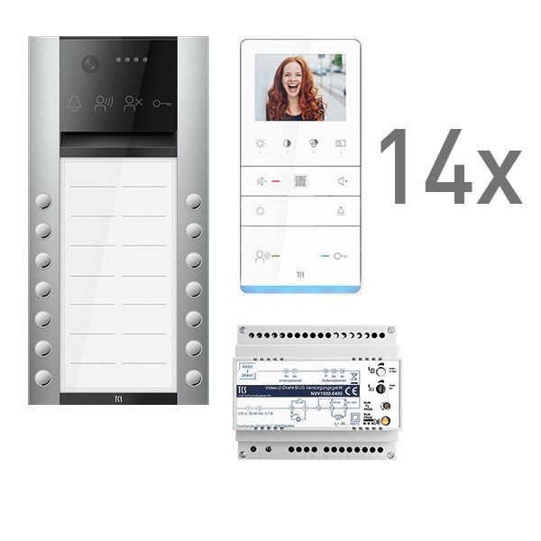 Vorkonfiguriertes Video Paket für 12 Wohneinheiten für den TCS:BUS bestehend aus: 1x PES PRO Video Außenstation 12T AP EN, Artikelnummer: AVA620212-0010, vorprogrammiert, 12x TASTA PRO Video Freisprecher 3,5" AP WS, Artikelnummer: IVW6511-0145, 1x Video-2-Draht:BUS Versorgungsgerät, Artikelnummer: NVV1000-0400. Das Paket ist ab Werk vorkonfiguriert und bedingt erweiterbar. Die Funktionen der Innen- und Außenstationen können mit TCS-Serviceprodukten bedingt verändert werden.