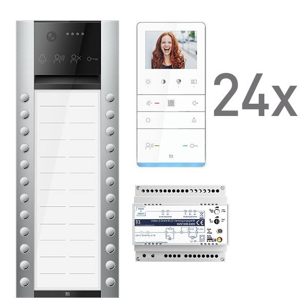 Vorkonfiguriertes Video Paket für 24 Wohneinheiten für den TCS:BUS bestehend aus: 1x PES PRO Video Außenstation 1T AP EN, Artikelnummer: AVA630224-0010, vorprogrammiert, 24x TASTA PRO Video Freisprecher 3,5" AP WS, Artikelnummer: IVW6511-0145, 1x Video-2-Draht:BUS Versorgungsgerät, Artikelnummer: NVV1000-0400. Das Paket ist ab Werk vorkonfiguriert und bedingt erweiterbar. Die Funktionen der Innen- und Außenstationen können mit TCS-Serviceprodukten bedingt verändert werden.