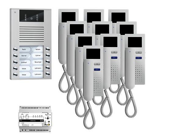 Vorkonfiguriertes Paket für 10 Wohneinheiten für den TCS:BUS bestehend aus: 1x Außenstation VPES color 130 Grad 10Tasten AP EN, Artikelnummer: AVE14103-0010, vorprogrammiert, 10x Objekt- Video Innenstation, Artikelnummer: IVH3222-0140, 1x Versorgungs- und Steuergerät Video 8 T, Artikelnummer: NBV2600-0400, Das Paket ist ab Werk vorkonfiguriert und bedingt erweiterbar, Die Funktionen der Innen- und Außenstationen können mit TCS-Serviceprodukten bedingt verändert werden, Die Komponenten unterstützen einen stand-alone-Betrieb