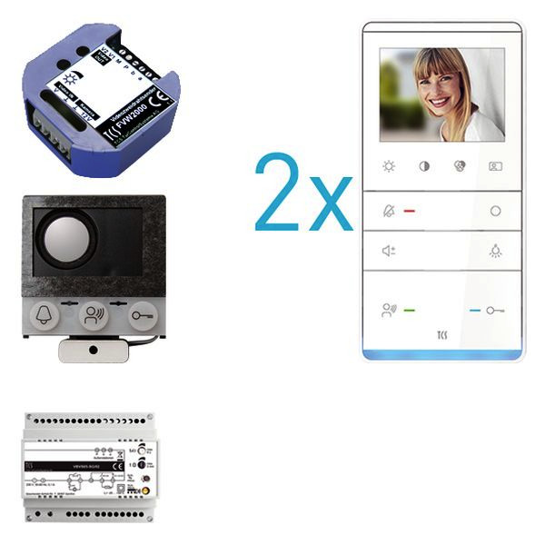Vorkonfiguriertes Paket (Briefkasten) für 2 Wohneinheiten für den TCS:BUS bestehend aus:, 1x Einbau-Türlautsprecher (Serie TCU) 16WE, Artikelnummer: ASI12000-0000, vorprogrammiert, 2x TASTA PRO Video Freisprecher 3,5 AP WS, Artikelnummer: IVW6511-0145, 1x Vers. + Steuerg. VBVS05/02 1Strang 6TE, Artikelnummer: VBVS05-SG/02, 1x Videozweidrahtsender UP, Artikelnummer: FVW2000-0600, Video Kamera bauseitig vorhanden, Das Paket ist ab Werk vorkonfiguriert und bedingt erweiterbar, Die Funktionen der Innen- und Außenstationen können mit TCS-Serviceprodukten bedingt verändert werden, Die Komponenten unterstützen einen stand-alone-Betrieb