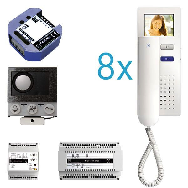 Vorkonfiguriertes Paket (Briefkasten) für 8 Wohneinheiten für den TCS:BUS bestehend aus:, 1x Einbau-Türlautsprecher (Serie TCU) 16WE, Artikelnummer: ASI12000-0000, vorprogrammiert, 8x Objekt- Video Innenstation, Artikelnummer: IVH3222-0140, 1x Versorgungs- und Steuergerät Video 8 TE, Artikelnummer: NBV2600-0400, 1x Videozweidrahtsender UP, Artikelnummer: FVW2000-0600, Video Kamera bauseitig vorhanden, Das Paket ist ab Werk vorkonfiguriert und bedingt erweiterbar, Die Funktionen der Innen- und Außenstationen können mit TCS-Serviceprodukten bedingt verändert werden, Die Komponenten unterstützen einen stand-alone-Betrieb