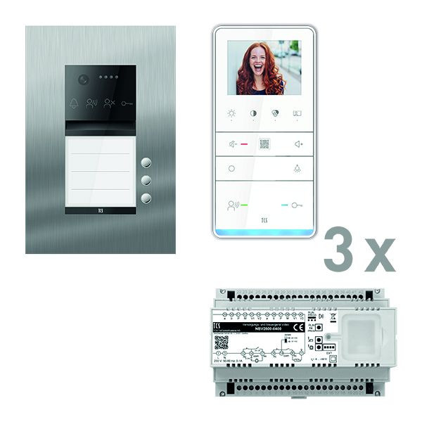 Vorkonfiguriertes Video Paket für 3 Wohneinheiten für den TCS:BUS bestehend aus: 1x PES PRO Video Außenstation 3T UP ES, Artikelnummer: AVU600103-0030, vorprogrammiert, 3x TASTA PRO Video Freisprecher 3,5" AP WS, Artikelnummer: IVW6511-0145, 1x Versorgungs- und Steuergerät Video 8 TE, Artikelnummer: NBV2600-0400. Das Paket ist ab Werk vorkonfiguriert und bedingt erweiterbar. Die Funktionen der Innen- und Außenstationen können mit TCS-Serviceprodukten bedingt verändert werden.