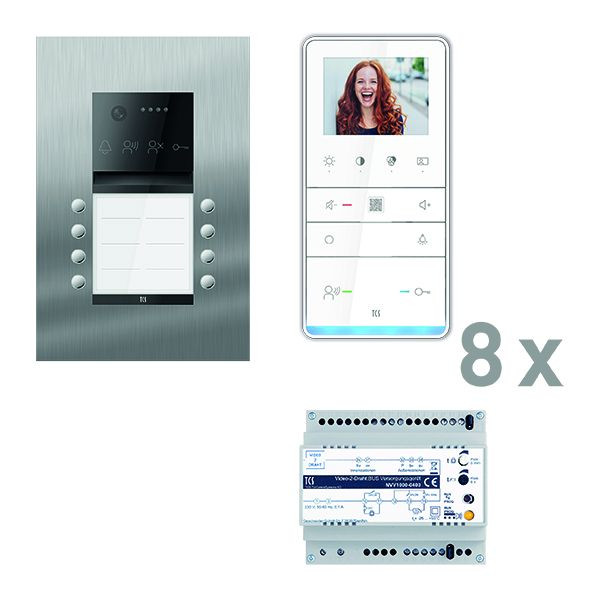 Vorkonfiguriertes Video Paket für 8 Wohneinheiten für den TCS:BUS bestehend aus: 1x PES PRO Video Außenstation 8T UP ES, Artikelnummer: AVU600208-0030, vorprogrammiert, 8x TASTA PRO Video Freisprecher 3,5" AP WS, Artikelnummer: IVW6511-0145, 1x Video-2-Draht:BUS Versorgungsgerät, Artikelnummer: NVV1000-0400. Das Paket ist ab Werk vorkonfiguriert und bedingt erweiterbar. Die Funktionen der Innen- und Außenstationen können mit TCS-Serviceprodukten bedingt verändert werden.