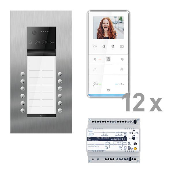 Vorkonfiguriertes Video Paket für 12 Wohneinheiten für den TCS:BUS bestehend aus: 1x PES PRO Video Außenstation 12T UP ES, Artikelnummer: AVU600212-0030, vorprogrammiert, 12x TASTA PRO Video Freisprecher 3,5" AP WS, Artikelnummer: IVW6511-0145, 1x Video-2-Draht:BUS Versorgungsgerät, Artikelnummer: NVV1000-0400. Das Paket ist ab Werk vorkonfiguriert und bedingt erweiterbar. Die Funktionen der Innen- und Außenstationen können mit TCS-Serviceprodukten bedingt verändert werden.