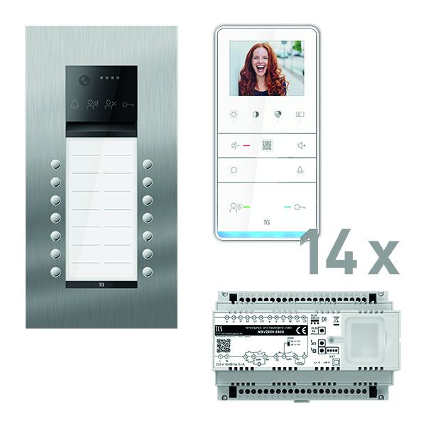 Vorkonfiguriertes Video Paket für 14 Wohneinheiten für den TCS:BUS bestehend aus: 1x PES PRO Video Außenstation 14T UP ES, Artikelnummer: AVU600214-0030, vorprogrammiert, 14x TASTA PRO Video Freisprecher 3,5" AP WS, Artikelnummer: IVW6511-0145, 1x Versorgungs- und Steuergerät Video 8 TE, Artikelnummer: NBV2600-0400. Das Paket ist ab Werk vorkonfiguriert und bedingt erweiterbar. Die Funktionen der Innen- und Außenstationen können mit TCS-Serviceprodukten bedingt verändert werden.